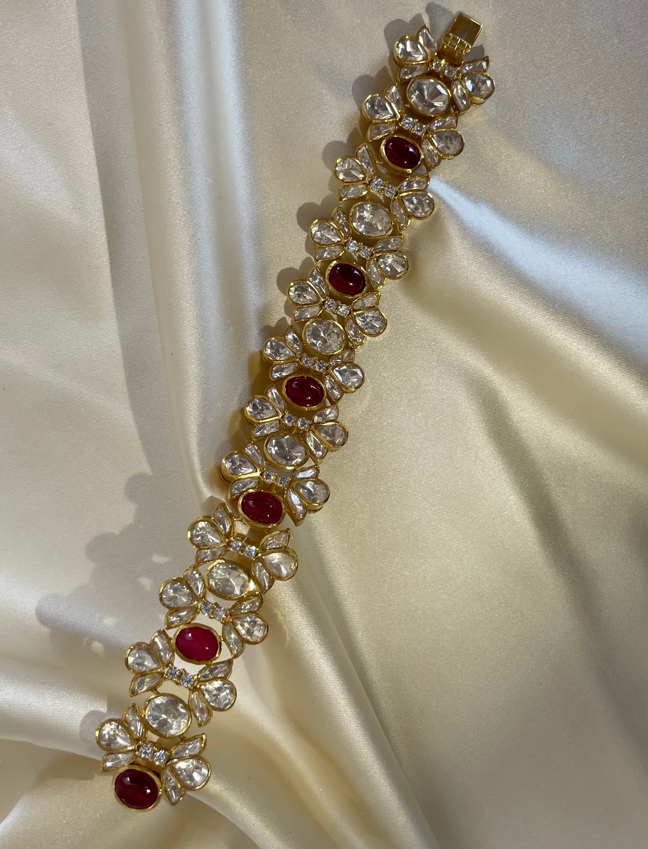 Handcrafted ornate designer's bracelet with handcut mossianite polki and semi precious stone.