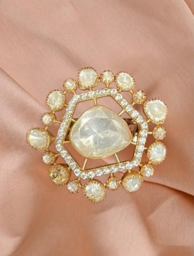 Handcrafted ornate jadau ring with handcut mossianite polki .