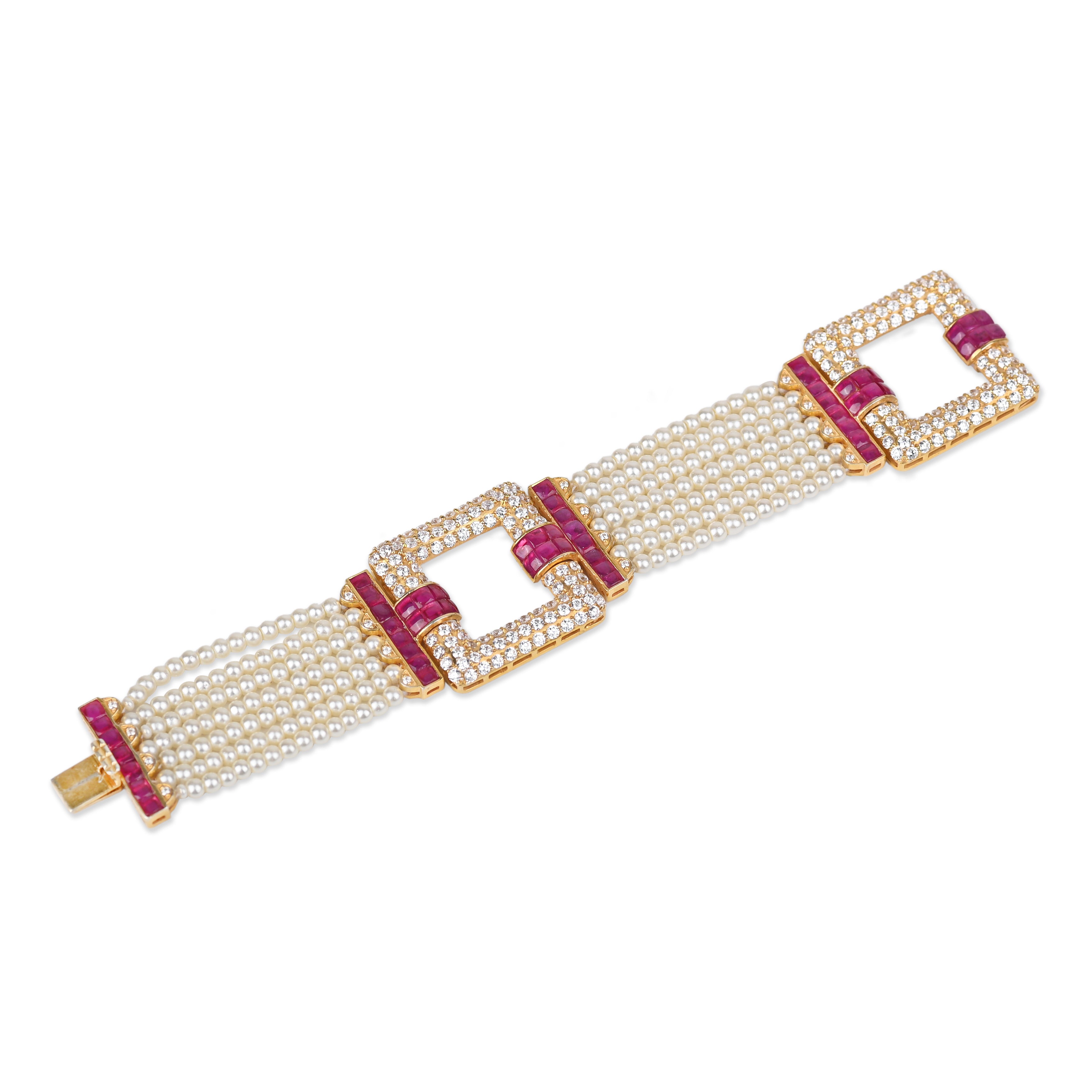 Handcrafted ornate jadau designer's bracelet. The bracelet features cutting rubies talaf .